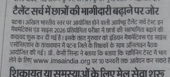The last date for registration for the "Aryabhatta Talent Search Test in Mathematics and Science" (ATSTMS) 2026 has been extended